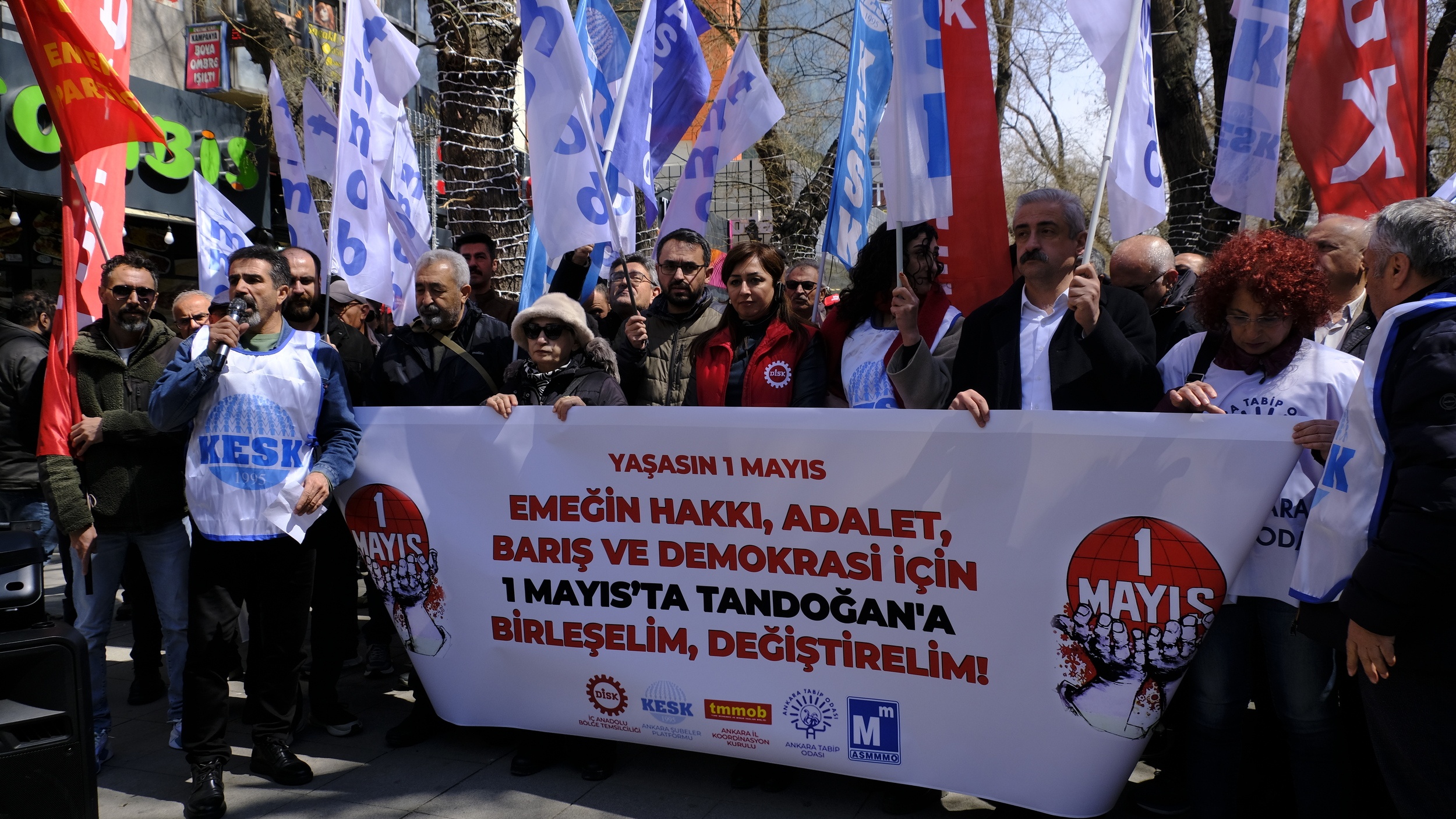 Devrimci İşçi Sendikaları Konfederasyonu (DİSK) İç Anadolu Bölge Temsilciliği, Kamu Emekçileri Sendikaları Konfederasyonu (KESK) Ankara Şubeler Platformu, Türk Mühendis ve Mimar Odaları Birliği (TMMOB) Ankara İl Koordinasyon Kurulu, Ankara Tabip Odası (ATO) ve Ankara Serbest Muhasebeci ve Mali Müşavirler Odası (ASMMMO), Yüksel Caddesi’nde bir araya gelerek 1 Mayıs Dünya İşçi Bayramı deklarasyonunu açıkladı. Açıklamayı DİSK İç Anadolu Bölge Temsilcisi Birgül Kaya yaptı.