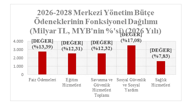 Bütçede yer alan kamu harcamalarının ekonomik sınıflandırmasına göre, 2026 yılında da bütçe ödenekleri içinde en büyük payı sırasıyla; cari transferlerin, personel giderlerinin ve faiz giderlerinin alması hedefleniyor. Cari transferler için toplam 6 trilyon 820 milyar TL ödenek öngörülüyor ve bunun 2 trilyon 329 milyar TL’si sosyal güvenlik sistemine yapılacak transferlerden oluşuyor. 1 trilyon 606 milyar TL tüm yerel yönetimlere veriliyor.