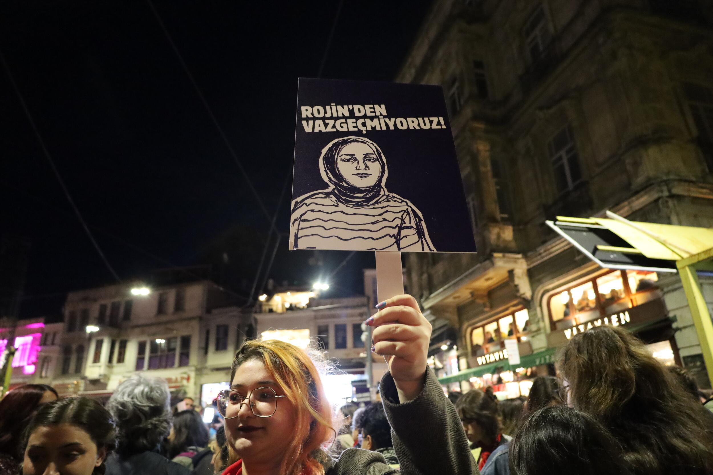 “Dem dema vejîna jinên ciwan e”, “Çi hat serê Rojîn?”, “Dilovası’nda katlettiğiniz kadın işçiler için düzeninizle savaşacağız”, “Sermaye ve patriyarkaya karşı büyüt isyanı”, “Rojava’dan Filistin’e direnen özgür kadınlar kazanacak”, “Rojin’den vazgeçmiyoruz”, “Yaşasın kadın devrimi” ve “Kadın mücadelesi özgür yaşamın manifestosudur” dövizleri dikkat çekti.
