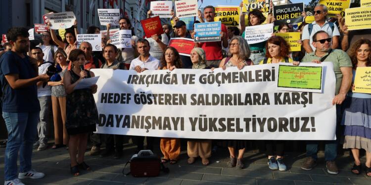 Şişhane Meydanında bir araya gelen 34 kurum, mültecilere yönelik saldırıların bir katliama dönüşmemesi için, yetkilileri acilen etkin önlemler almaya ve saldırganların cezalandırılması için sürecin ivedilikle işletilmesi çağrısında bulunuldu