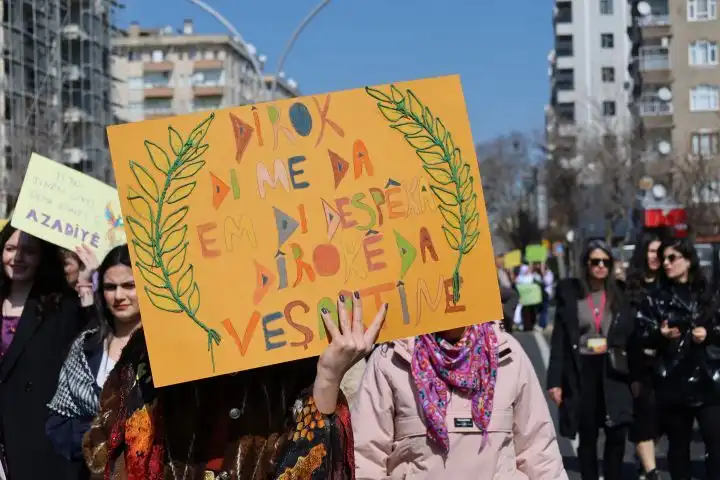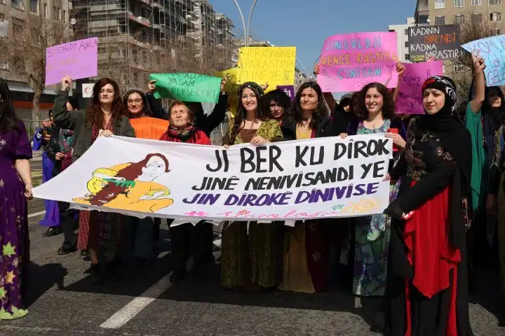 Özgür Kadın Hareketi (Tevgera Jinên Azad-TJA), Halkların Eşitlik ve Demokrasi Partisi (DEM Parti) 8 Mart Dünya Kadınlar Günü’nde “Direnişle özgürleşiyor, demokratik toplumu örüyoruz” şiarıyla Amed’de miting düzenliyor. Ofis’teki AZC Plaza önünde toplanan kadınlar “Jin Jiyan Azadî”, “Jin jiyan azadî emê azad bikin rêbertî” sloganları ile miting alanına yürüdü.