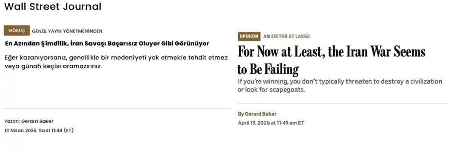 Trump ve Netanyahu’nun başını çektiği emperyalist-Siyonist ittifak, İran’a açtığı savaşı kaybediyor. Öyle ki Amerika’nın ünlü ana akım gazetelerinden biri olan Wall Street Journal Gazetesi bile şöyle bir paylaşımda bulunarak bu gerçeği kabul ediyor: