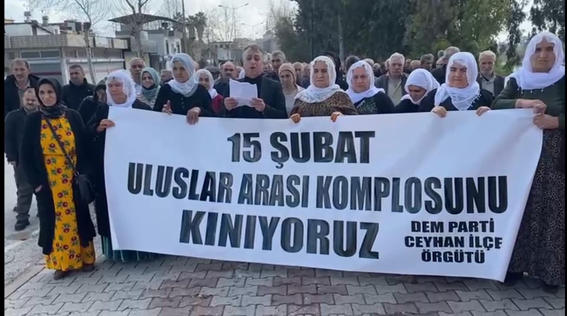 DEM Parti Ceyhan İlçe Örgütü, Kürt Halk Önderi Abdullah Öcalan’a yönelik 15 Şubat Uluslararası Komplo’yu 27’nci yılında yaptığı açıklama ile protesto etti. İlçe binası önünde yapılan açıklamaya, çok sayıda kişi katıldı. Açıklamayı yapan DEM Parti Ceyhan İlçe Eşbaşkanı Tahir Özdemir, Abdullah Öcalan’ın şahsında yürütülen tecrit ve saldırı politikalarına karşı Barış ve Demokratik Toplum Süreci etrafında örülen mücadelenin sürdürüleceği vurguladı. Tahir Özdemir, 9 Ekim 1998’de başlayan sürecin 15 Şubat 1999’da Abdullah Öcalan’ın İmralı’ya getirilmesiyle devam ettiği söyleyerek, ağır tecrit koşullarına rağmen demokratik çözüm ve onurlu barış perspektifinin bu komployu boşa çıkardığını ifade etti.