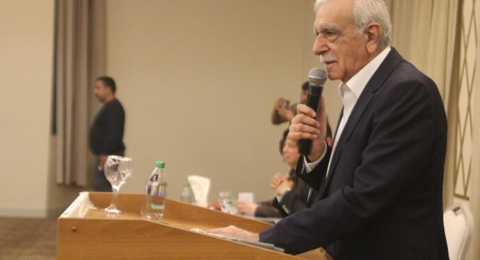 Ardından söz alan Kürt siyasetçi Ahmet Türk, salonda bulunanları selamlayarak konuşmasına başladı. 14 Mayıs seçimlerinin önemine değinen Türk, bu seçimlerin aynı zamanda ezilen halklar içinde tarihi bir fırsat taşıdığına dikkati çekti. Türk devamla, “İnanıyorum ki, halkımız bu seçimlerde bugüne kadar yürütülen siyaseti, baskı ve inkar politikalarını ortadan kaldırmak için gereken cevabı verecektir. Bugün baktığımızda Kürt sorunu elbette Türkiye’nin en büyük sorunu ama Kürt sorunun yanında emekçilerin de sorunu var. Aslında Türkiye’de bir bütün olarak demokrasi sorunu var. Eğer bu ülkede demokrasiyi kalıcı hale getiremezsek, demokratik bir düzeni oluşturamazsak inan ki ne Kürt sorunu, ne de demokrasi sorunu çözülür” diye belirtti.