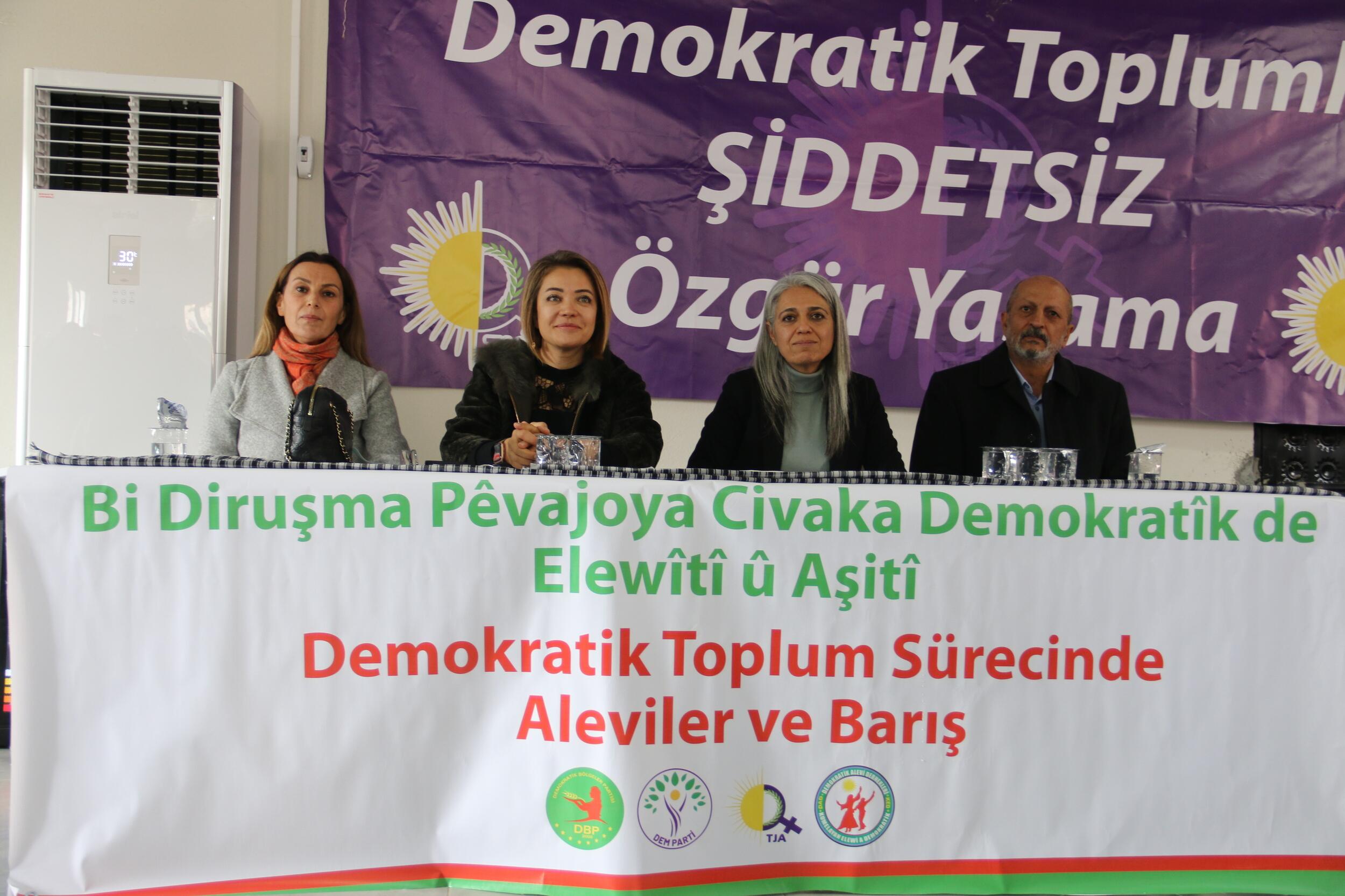 Buluşmada konuşan DBP Eş Genel Başkanı Çiğdem Kılıçgün Uçar ise süreci sahiplenme çağrısında bulunarak, “Bu ülkenin kurucu öznesi olan Aleviler ve Kürtler bugün en ağır inkâr döneminden geçiyor. Tek uluslu bir gerçeklikten söz edilemez. Yeni dönemde toplumsal karakter kazanılacaksa, bu ancak halkların değerlerini taşıyan bir karakterle mümkün olabilir. Süreci sahiplenmek kendi inancımızı, kimliğimizi sahiplenmektir. Özgürlüğü, adaleti, hukuku sahiplenmektir. Bu işin Alevi’si, Sünni’si, Kürt’ü yoktur” ifadelerini kullandı.