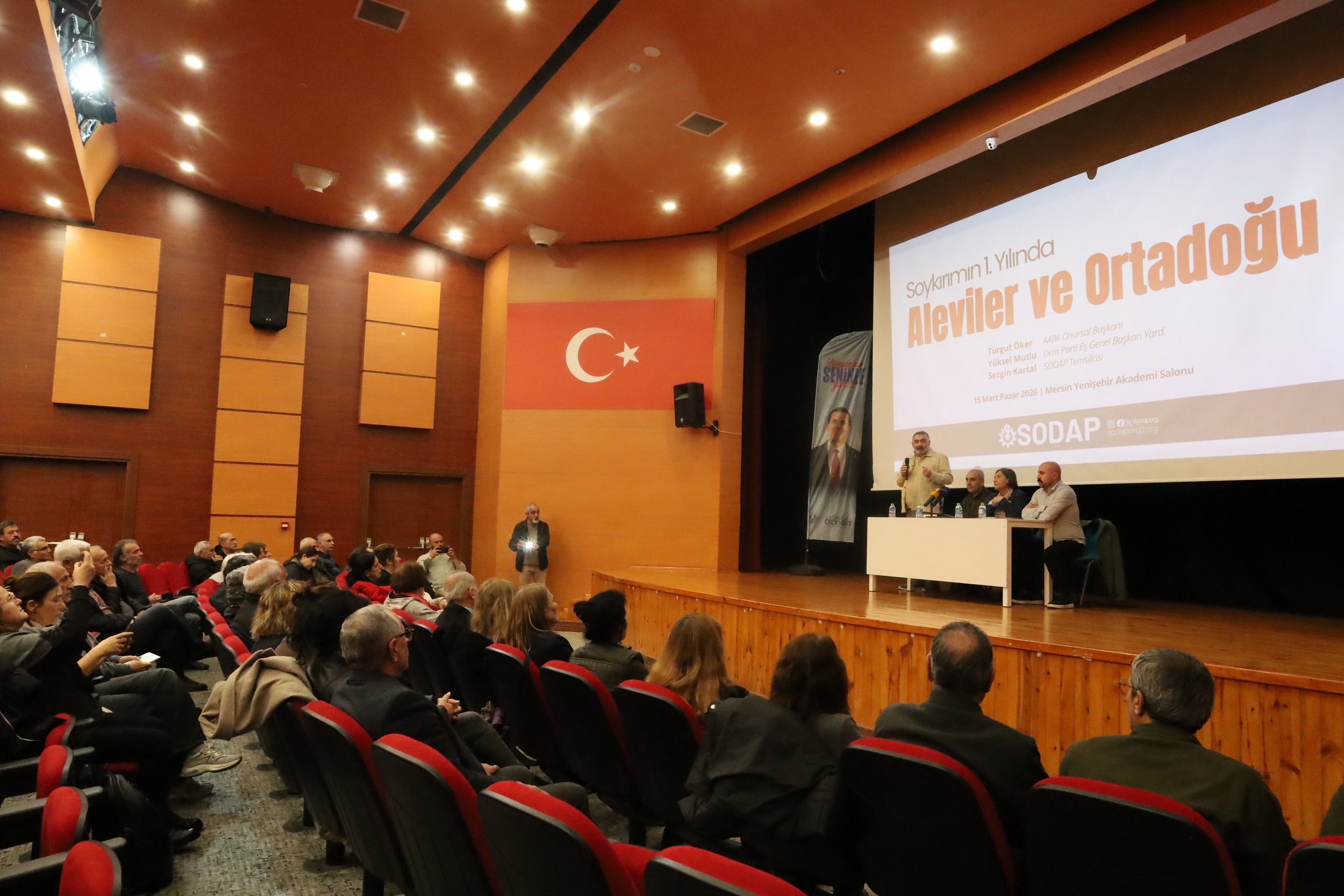 Sosyalist Dayanışma Platformu, “Soykırımın 1’nci yılında Aleviler ve Ortadoğu” başlığıyla panel düzenledi. Mersin Yenişehir Belediyesi Akademi Salonu’nda gerçekleşen panelde konuşmacı olarak Alman Alevi Birlikleri Federasyonu (AABF) Onursal Başkanı Turgut Öker, Halkların Eşitlik ve Demokrasi Partisi (DEM Parti) Eş Genel Başkan Yardımcısı Yüksel Mutlu ve SODAP Temsilcisi Sezgin Kartal yer aldı. Panele, kentteki demokratik kurum temsilcileri de katılım sağladı.