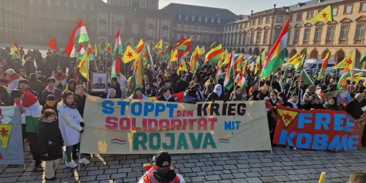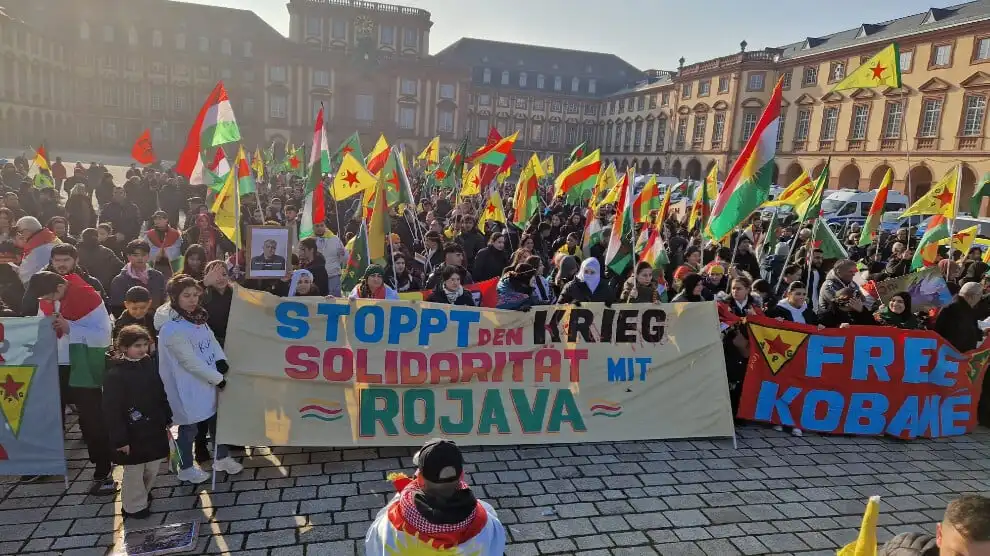 Almanya’nın Mannheim şehrinde binlerce Kürdistanlı ve dostları, Rojava’ya sahip çıkmak için sokaklara döküldü. Schloss’tan başlayan yürüyüş, Altefeuerwache’ye kadar devam etti. Katılımcılar, Efrîn, Kobanê ve Rojava’ya sahip çıkacaklarını vurgulayan sloganlar attı.