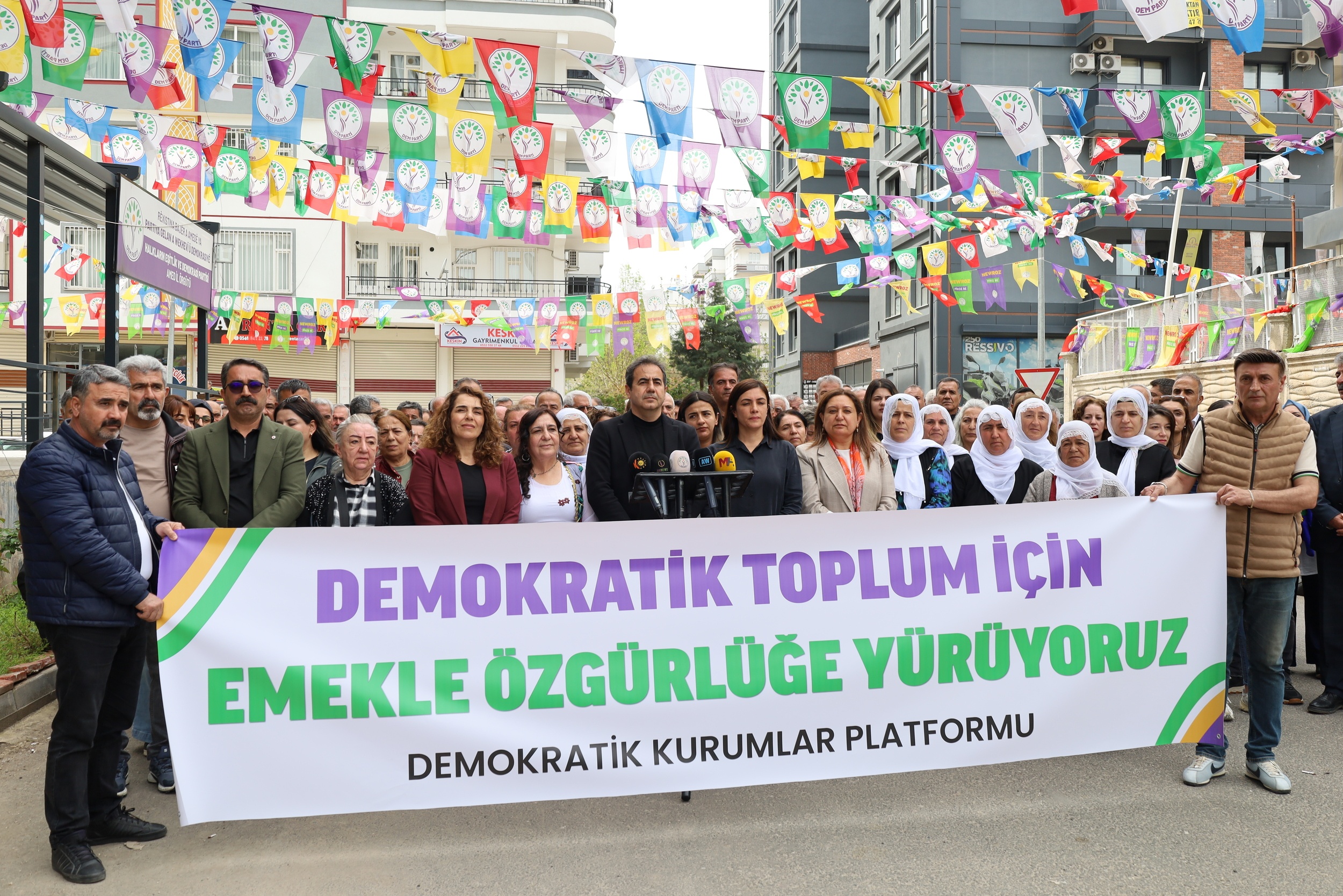 Demokratik Bölgeler Partisi (DBP) Amed İl Eşbaşkanı Ruçem Vefa Elyakut da, “Kürt Halk Önderi Abdullah Öcalan’ın çağrısıyla süreç yeni bir aşamaya geldi. Sokaklarda Özgürlük için mücadelemizi sürdürüyoruz. Bugün de emekçiler için, demokratik toplum için 1 Mayıs’ta İstasyon Meydanı’nda miting düzenliyoruz. Barış, özgürlük isteyenler olarak gelin bu çağrıya sahip çıkın. Onurlu bir barış için, özgürlük için İstasyon Meydanı’na gelelim. Abdullah Öcalan’ın fiziki özürlüğü için, barış için gelin sesimizi yükseltelim” çağrısında bulundu.