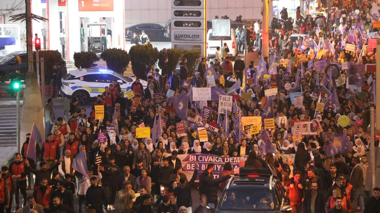 Tevgera Jinên Azad (TJA) öncülüğünde, 25 Kasım Kadına Yönelik Şiddetle Uluslararası Mücadele Günü kapsamında Amed’in Rezan (Bağlar) ilçesine bağlı Eski Cezaevi önünden, Yenişehir ilçesine bağlı Ofis AZC Plaza’ya kadar yürüyüş gerçekleştirildi. Yürüyüşe TJA, Mezopotamya Kadın Gazeteciler Derneği (MKG), Diyarbakır Şiddetle Mücadele Ağı ile Dicle Amed Kadın Platformu (DAKAP) bileşenleri, sivil toplum örgütleri, Halkların Eşitlik ve Demokrasi Partisi (DEM Parti) Amed Büyükşehir Belediye Eşbaşkanı Serra Bucak ile ilçe belediye eşbaşkanları, DEM Parti Sözcüsü Ayşegül Doğan, TJA aktivisti Sebahat Tuncel, DEM Parti ve Demokratik Bölgeler Partisi (DBP) il, ilçe örgütleri ve yüzlerce kadın katıldı. Kadınlar; “Li hemberî tundiyê em jiyana azad birêxistin dikin”, “Em bi Jin, Jiyan, Azadî xwe diparêzin”, “Eğer bu saldırıların birinci hedefiysek, o zaman en önde direnenler bizler olmalıyız” ve “Kadınların barışı özgür yaşamı savunmaktır” yazılı pankartlar ile katledilen kadınların fotoğraflarını ve dövizler taşıdı. Yürüyüş sırasında kadınlar sık sık, “Jin Jiyan Azadî”, “Rojin’e uzanan eller kırılsın”, “Erkek adalet değil gerçek adalet” ve “Bijî Serok Apo” sloganları attı. Ayrıca yürüyüş sırasında katledilen kadınların isimleri okunarak, “Burada” denildi.