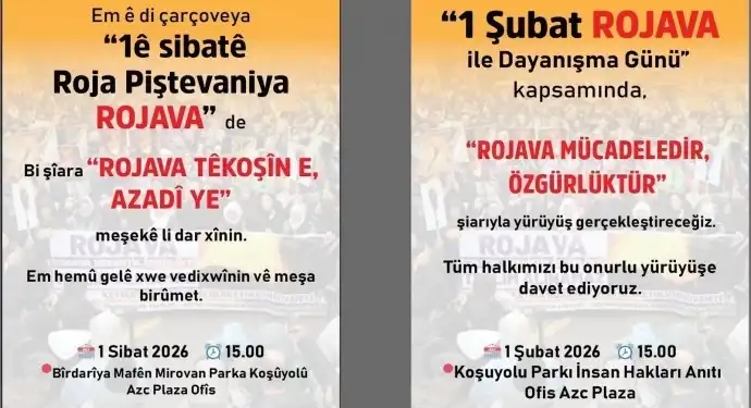 Demokratik Kurumlar Platformu, 1 Şubat Rojava İle Dayanışma Günü kapsamında, “Rojava özgürlüktür, mücadeledir” şiarıyla yürüyüş gerçekleştirecek. Koşuyolu Parkı İnsan Hakları Anıtı önünden Ofis Semti’nde bulunan AZC Plaza önüne kadar sürecek olan yürüyüş, saat 15.00’da başlayacak.