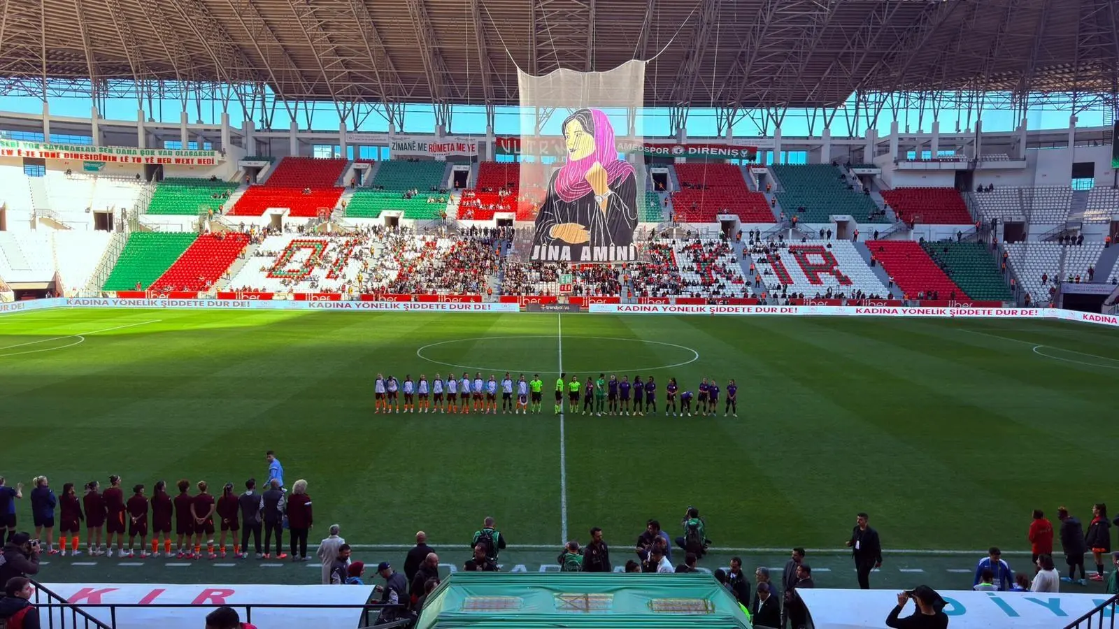 Amedspor Kadın Futbol Takımı, Trabzonspor A.Ş. Kadın Futbol Takımı’nı konuk ettiği maçta Jîna Emînî’nin dev koreografisi açıldı