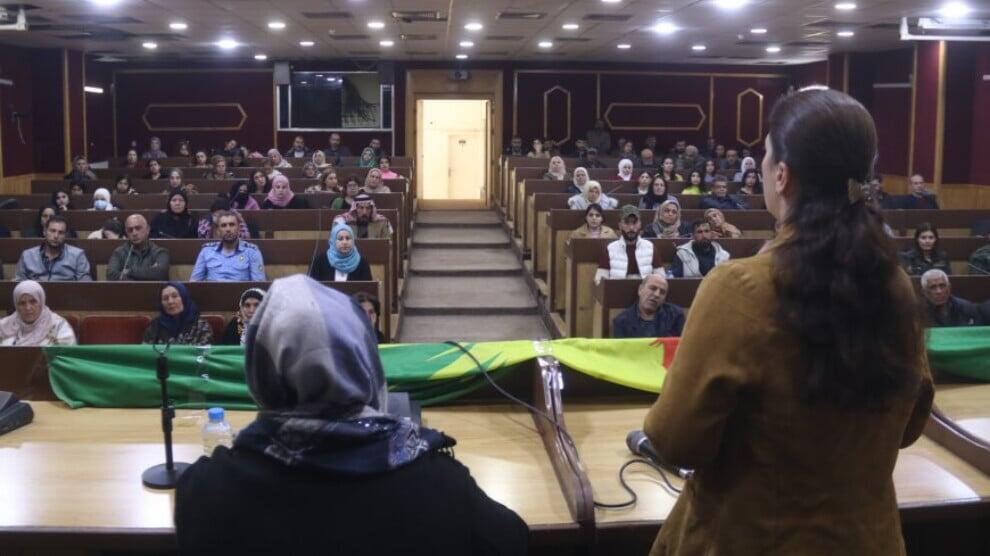Kongra Star ve Suriye Demokratik Meclisi (MSD), 25 Kasım Kadına Yönelik Şiddette Karşı Uluslararası Mücadele Günü programı kapsamında, Cizîr Kantonu’na bağlı Amûdê kentinde Yasama Meclisi salonunda bir toplantı düzenledi.