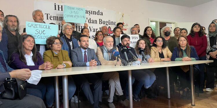 Ankara Cumhuriyet Başsavcılığı tarafından gazetecilere yönelik yürütülen soruşturma kapsamında Ankara, İstanbul, Van, Diyarbakır, Urfa, Mersin ve Mardin’de birçok eve sabah saatlerinde düzenlenen eş zamanlı baskılar sonrası Mezopotamya Ajansı (MA) Yazı İşleri Müdürü Diren Yurtsever, MA muhabirleri Deniz Nazlım, Selman Güzelyüz, Zemo Ağgöz, Berivan Altan, Hakan Yalçın, Emrullah Acar ve Ceylan Şahinli ile JINNEWS muhabirleri Habibe Eren ve Öznur Değer gözaltına alınmasına dair İnsan Hakları Derneği (İHD) Ankara Şube’de basın toplantısı düzenlendi.