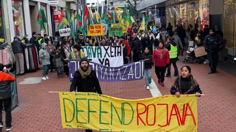 Almanya’nın Karlsruhe kentinde, Baden Württemberg ve Bayern Kurdistani Halklar Federasyonu (FED-GEL) öncülüğünde gerçekleştirilen yürüyüşe Die Linke (Sol Parti), Almanya Kürt Kadınlar Birliği (YJK-E), İran Kürdistan Demokrat Partisi (PDK-İ) yanı sıra çok sayıda enternasyonalist grup ve dost kurum destek verdi. Yürüyüşe binlerce kişi katıldı. Marktplatz’ta saygı duruşu ile başlayan yürüyüşte, Rojava’ya yönelik saldırılara dikkat çeken pankart ve dövizler taşındı. Kentin işlek caddelerinde ilerleyen yürüyüş boyunca sık sık “Bijî berxwedana Rojava”, “Şehîd namirin”, “Jin, Jiyan, Azadî” ve “Yekîtiya gelê Kurd” sloganları atıldı. Yürüyüş, yeniden Marktplatz’a dönülmesinin ardından burada düzenlenen mitingle sona erdi. Miting alanında kurum temsilcileri birer konuşma yaparak Rojava’ya yönelik saldırı ve kuşatmaya dikkat çekti.