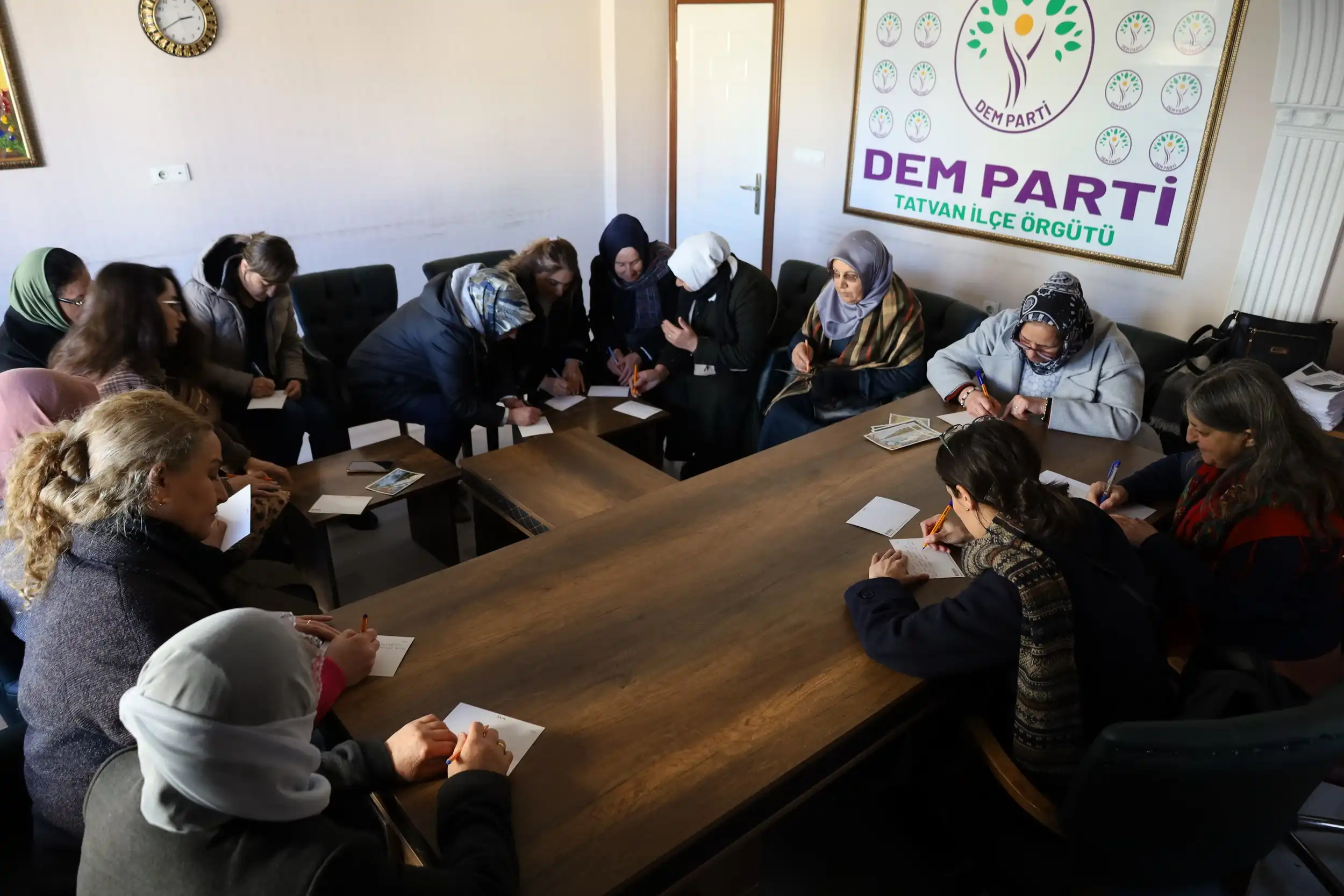 Özgür Kadın Hareketi (Tevgera Jinen Azad-TJA) öncülüğünde Bedlîs’te 8 Mart Dünya Kadınlar Günü kapsamında tutsak kadınlar için kart gönderildi. Halkların Eşitlik ve Demokrasi Partisi (DEM Parti) Tetwan İlçe Örgütü Binasında bir araya gelen kadınlar, burada kartları 8 Mart mesajlarıyla dolduran kadınlar tutsak kadınların 8 Mart’ını kutladı. Temsili olarak her cezaevinden bir tutsak kadına yazılan 8 Mart kartları, İlçe PTT binasından cezaevlerine gönderilmek üzere yollandı.