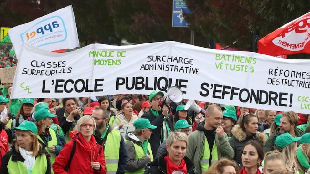 Yaklaşık 120 bin öğretmen, MR-Engagés hükümetinin eğitim alanında planladığı tasarruf önlemlerini protesto etmek için iş bıraktı.