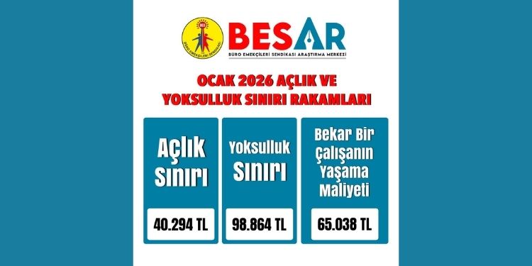 Büro Emekçileri Sendikası Araştırma Kurumu (BES-AR), 2026 yılı Ocak ayının açlık ve yoksulluk sınırı verilerinin yer aldığı raporunu açıkladı. BES-AR’ın gıda fiyatları üzerinden yola çıkarak yaptığı hesaplamaya göre; dört kişilik bir memur ailesinin sağlıklı beslenmesi için aylık yapması gereken harcama tutarının Ocak ayı için 40 bin 294, tek bir çalışanın yaşam maliyetinin ise 65 bin 038 lira olduğunu kaydetti. Rapora göre, 28 bin 75 lira alan asgari ücretlinin, 40 bin 294 lira olan açlık sınırının yüzde 43,52 altında ücret aldığı dikkat çekti. Açlık sınırının bir önceki aya göre yüzde 3,29 arttığı kaydedilen açıklamada, bu sınır bir önceki yılın aynı ayına göre yüzde 31,61 artış gösterdi.
