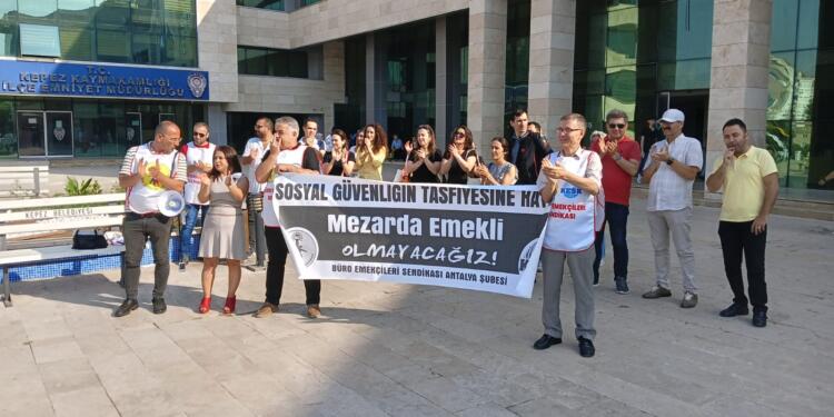 Büro Emekçileri Sendikası Antalya Şubesi (BES), “Kamuda Tasarruf Tedbirleri Genelgesi” kapsamında ulaşım servislerinin kaldırılmasını protesto etti. Kepez Sosyal Güvenlik Merkezi önünde bir araya gelen BES’liler, kararı alkışlarla protesto etti. Sık sık “Servis hakkımız gasp edilemez”, “Birleşe birleşe kazanacağız” sloganlarının atıldığı eylemde, ulaşım servislerinin yeninden sağlanması talep edildi.