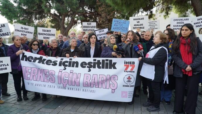 İHD ve TİHV, İnsan Hakları Haftası kapsamında Sultanahmet Meydanında açıklama yaptı. “Herkes için eşitlik, herkes için barış” pankartının açıldığı açıklamada, “Tecrit işkencesine son”, “Çocuk istismarına dur de”, “Polis şiddetine son”, “Düşünce ve ifade özgürlüğü önümdeki engeller kaldırılsın”, “iş-işçi cinayetlerine son” dövizleri taşındı. “İnsanlık onuru işkenceyi yenecek”, “İnsan haklarıyla insandır” sloganlarının atıldığı açıklamaya, İHD Eş Genel Başkanı Oya Ersoy ve hak savunucuları, siyasi partiler, sivil toplum örgütü temsilcileri ile çok sayıda kişi katıldı.