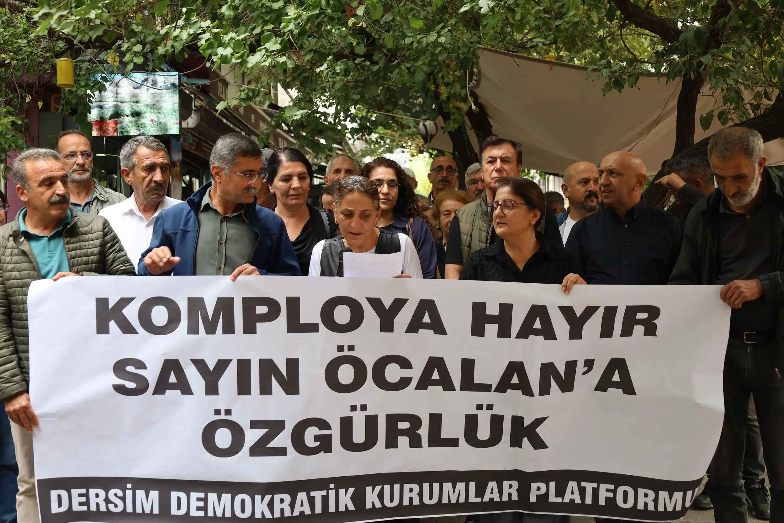 Dêrsim’de ise komplo Sanat Sokağı’nda yapılan açıklamayla protesto edildi. Açıklamaya çok sayıda siyasetçi ve kurum temsilcisi katıldı. “Komploya hayır Sayın Öcalan’a özgürlük” pankartının açıldığı açıklamayı, Demokratik Kurumlar Platformu adına Demokratik Alevi Dernekleri (DAD) üyesi Hülya Bozkurt okudu.