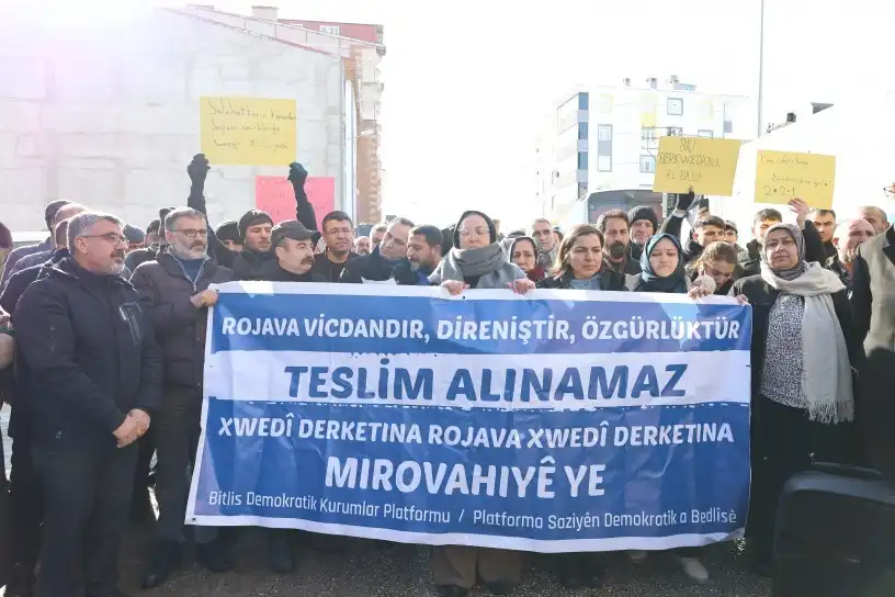 Bedlîs Demokratik Kurumlar Platformu, Rojava’ya dönük saldırıları protesto etmek amacıyla basın açıklaması gerçekleştirdi. Halkların Eşitlik ve Demokrasi Partisi (DEM Parti) Xelat İlçe Binası önünde gerçekleştirilen açıklamada Türkçe ve Kürtçe “Rojava vicdandır, direniştir, özgürlüktür teslim alınamaz” pankartı açılırken, “Em nebin bira em e bibin şiva gura”, “Free Rojava” yazılı dövizler taşındı. DEM Parti İlçe Binası önünden yürüyen kitle açıklamanın yapılacağı yere kısa bir yürüyüş gerçekleştirdi. Açıklamada konuşan DEM Parti Xelat İlçe Eşbaşkanı Fesih Bitim, “Rojava’ya dönük saldırıları kabul etmeyeceklerini belirtti.