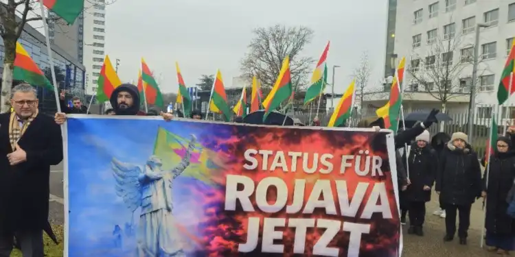 Avrupa Kürt Kadın Hareketi (TJK-E) öncülüğünde bir araya gelen kitle, uluslararası kurumlara Rojava’daki demokratik modelin güvence altına alınması çağrısında bulundu. Eylemde, “Bijî Berxwedana YPG/YPJ” ve “Jin, Jiyan, Azadî” sloganlarıyla başladı. Eylemde, üzerinde Almanca “Status für Rojava Jetzt” (Rojava’ya Şimdi Statü) yazılı dev pankartlar ile YPG ve YPJ flamaları taşındı.