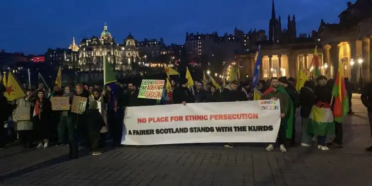 Edinburgh’daki eylem The Mound’da gerçekleştirildi. Açıklamalarda, Britanya’nın DAİŞ’e karşı mücadelede Kürt güçleriyle müttefik olduğu, ancak bugün bu güçlerin yalnız bırakıldığı vurgulandı.