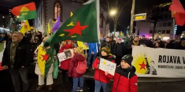 İsviçre’nin Aargau Kantonuna bağlı Baden kentinde, binlerce Kürdistanlının katılımı ile Baden Tren İstasyonu (Bahnhof) önünde yürüyüş düzenlendi. Aarau Demokratik Kürt Toplum Merkezi (Mala Kurda) ile Aarau Rojbin Kadın Meclisi öncülüğünde düzenlenen yürüyüşe binlerce Kürdistanlının yanı sıra enternasyonalist devrimci hareketler de destek verdi. “Bi hev re serhildan“, “Rojava‘da soykırıma son” pankartları açan kitle, Önder Apo’nun posterleri ile YPG ve YPJ bayrakları taşıyarak, sık sık, “Bijî Serok Apo”, “Bijî berxwedana Rojava”, “Jin Jiyan, Azadî”, “Terörist Erdoğan-terörist Colani” sloganları attı.