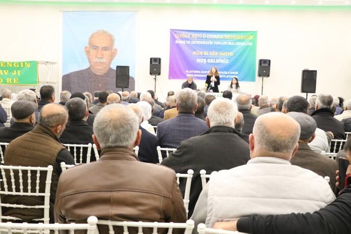 Demokratik Kurumlar Platformu, Barış ve Demokratik Toplum Buluşmaları kapsamında Farqîn’de (Silvan) halk toplantısı düzenledi. Çok sayıda siyasi parti ile sivil toplum örgütü temsilcisinin yanı sıra yurttaşların katıldığı toplantıya, Çetin Arkaş, Özgür Kadın Hareketi’nden (Tevgera Jinên Azad-TJA) Ayla Akat Ata ve Asrın Hukuk Bürosu avukatlarından Raziye Öztürk konuşmacı olarak katıldı.