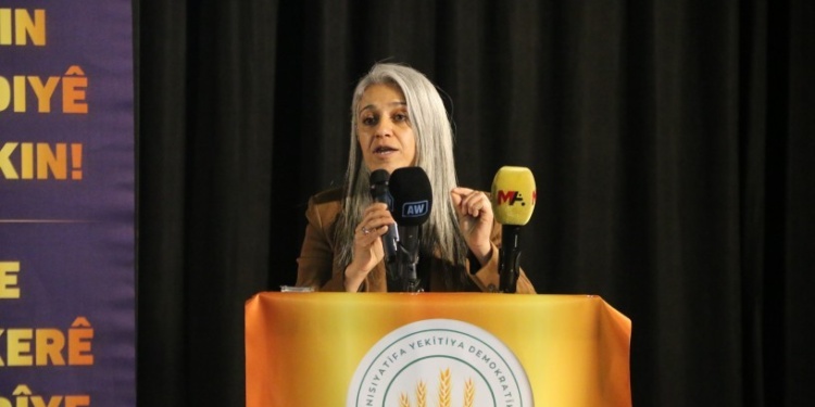 Demokratik Birlik İnisiyatifi, “Birlik ruhu ile başaracağız” şiarıyla 2’nci Olağan Genel Kurulu, Demokratik Bölgeler Partisi (DBP) Eş Genel Başkanı Çiğdem Kılıçgün Uçar’ın konuşmasıyla devam etti. Çiğdem Kılıçgün Uçar, konuşmasına Halep Asayiş Komutanı Ziyad Halep ile Halep’te cenazesi yüksek binadan atılan kadın savaşçı Deniz Çiya’yı anarak başladı.
