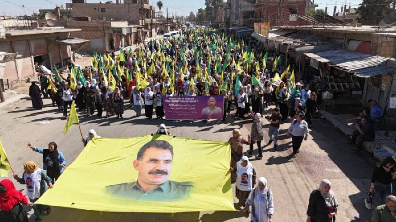 Kuzey ve Doğu Suriye’nin Cizîrê Kantonu’nda binlerce kadın, “Önder Apo’nun fiziki özgürlüğü çözüm ve barışın anahtarıdır” sloganıyla Tirbespiyê kentinde bir yürüyüş düzenledi.