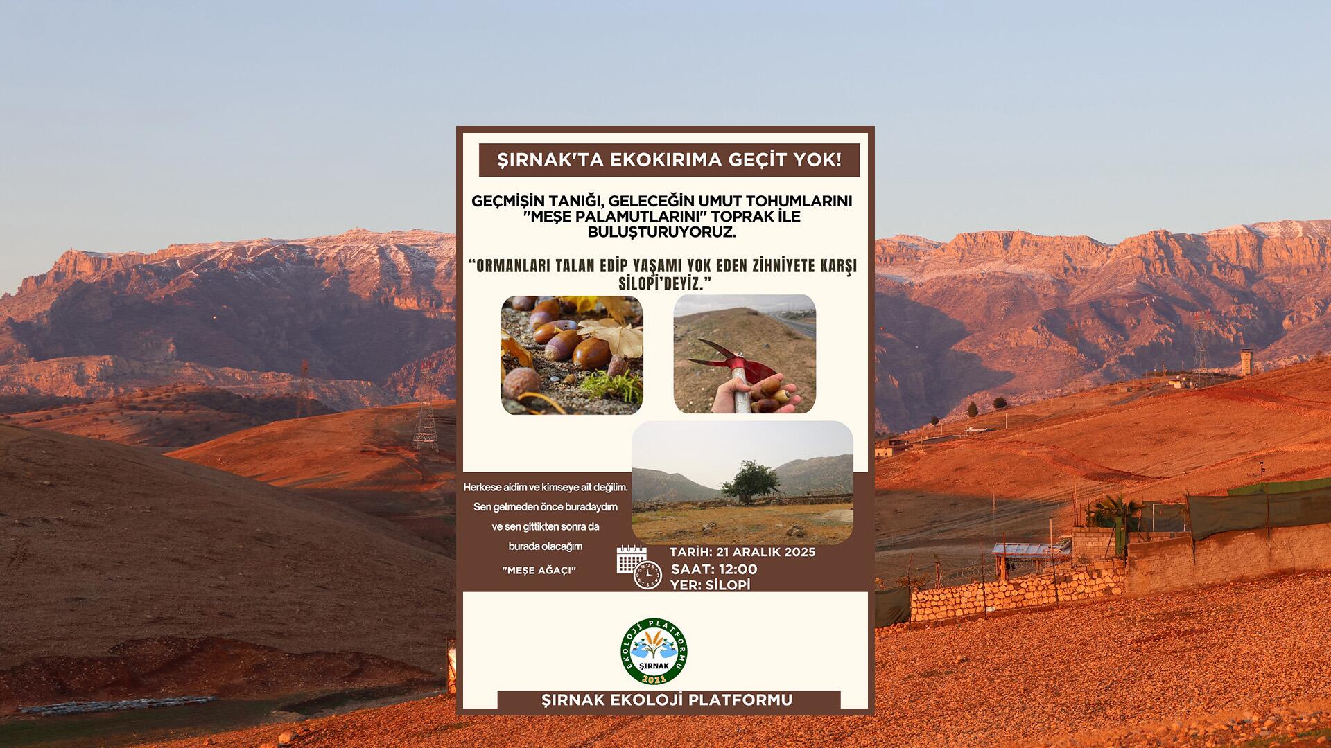 Talana karşı eylem ve etkinlikler çeşitli biçimlerde sürerken yaşanan tahribatın sonuçlarını kısmen de ortadan kaldırılabilecek etkinlikler de şekillenmeye başlandı. Mezopotamya Ekoloji Hareketi’nin başlattığı “Bir palamut da sen topla, bir palamut da sen ek” şiarıyla başlattığı kampanya kapsamında Şirnex Ekoloji Platformu, yarın Silopiya’da (Silopi) 50 bin palamut ekecek. Palamut ekimi için 2009’dan beri faaliyette olan Ciner Grubu’nun 3 üniteden oluşan Silopi Termik Santrali’nin bulunduğu Bêspin beldesi Cûdî Dağı etekleri seçildi.