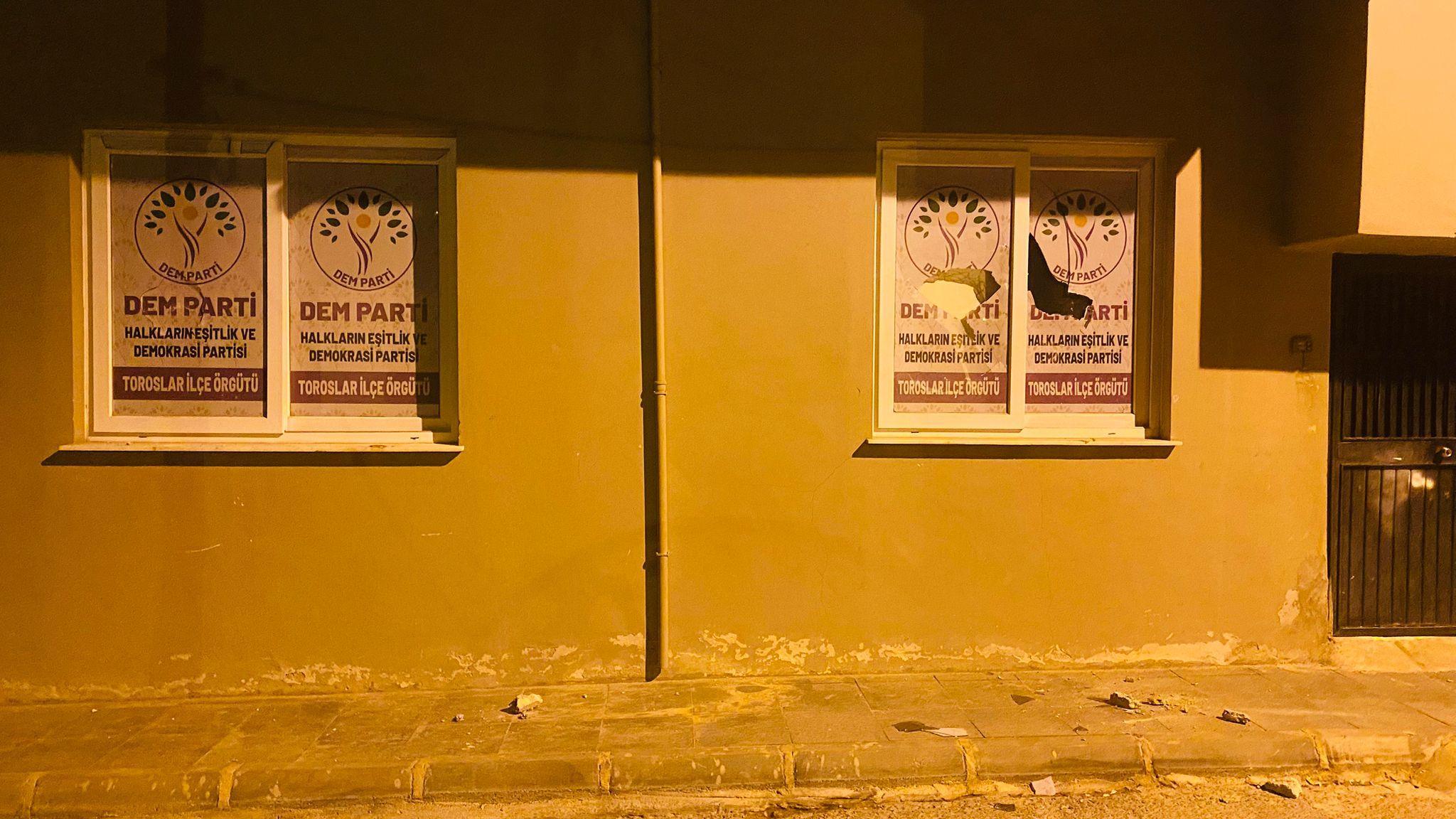 Halkların Eşitlik ve Demokrasi Partisi (DEM Parti) Toroslar İlçe Örgütü binasına dün gece saatlerinde taşlı saldırı gerçekleştirildi. Mahallelilerin müdahalesi üzerine saldırgan yakalandı, ardından gözaltına alınarak Mersin İl Emniyet Müdürlüğü’ne götürüldü.