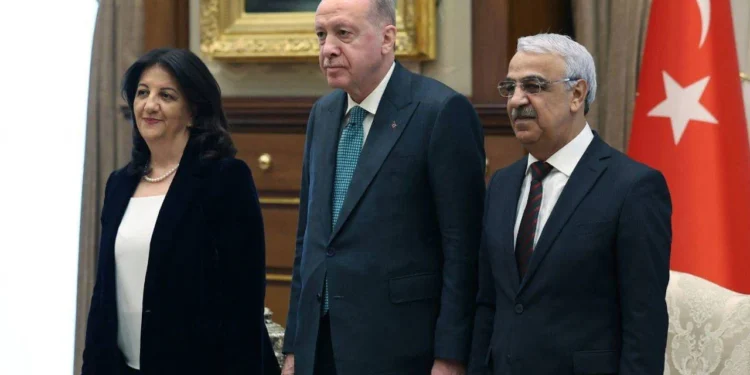 Halkların Eşitlik ve Demokrasi Partisi (DEM Parti) İmralı Heyeti üyeleri Mithat Sancar ve Pervin Buldan, dün AKP’li Cumhurbaşkanı Tayyip Erdoğan ile bir görüşme gerçekleştirdi. Yaklaşık 1 saat süren görüşmeye dair yazılı DEM Parti’den yazılı açıklama yapıldı.