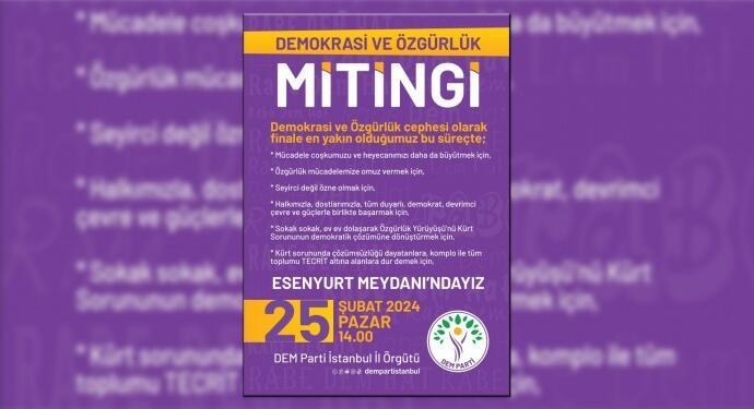 DEM Parti İstanbul İl Örgütü, ‘Büyük Özgürlük Yürüyüşü’ne destek olmak amacıyla 25 Şubat günü ‘Özgürlük Mitingi’ düzenleyecek
