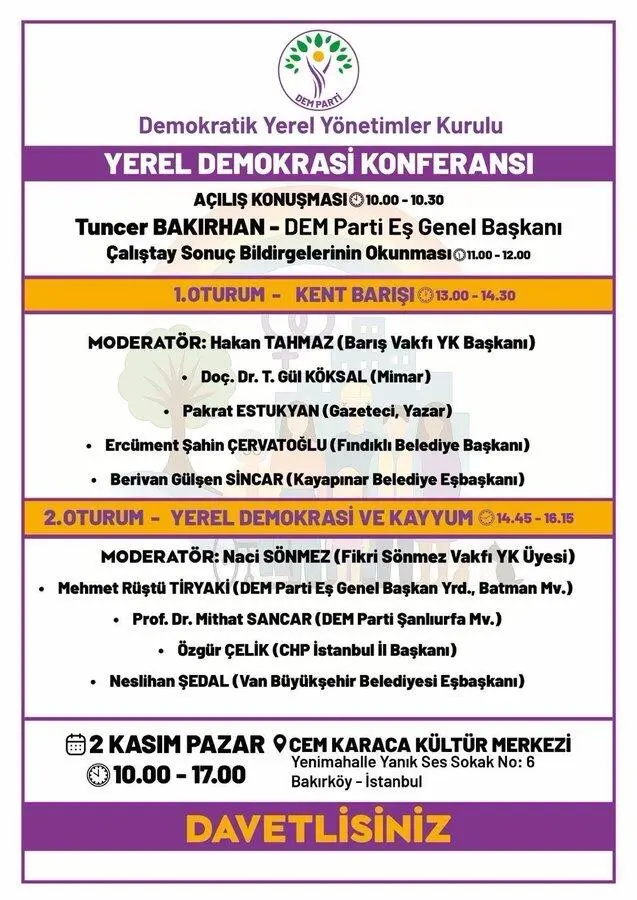 Halkların Eşitlik ve Demokrasi Partisi (DEM Parti) Demokratik Yerel Yönetimler Kurulu, 2 Kasım’da İstanbul Bakırköy’de bulunan Cem Karaca Kültür Merkezi’nde “Yerel Demokrasi Konferansı” düzenleyecek. DEM Parti Eş Genel Başkanı Tuncer Bakırhan’ın açılış konuşmasıyla başlayacak olan konferans 10.00-17.00 saatleri arasında gerçekleşecek.