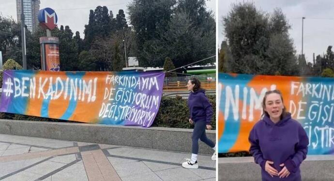 Oyuncu Demet Evgar, 8 Mart Dünya Kadınlar Günü öncesinde tek kişilik eylem gerçekleştirdi. “Ben kadınım farkındayım, değişiyorum değiştiriyorum” yazılı pankartı metronun girişine astı.