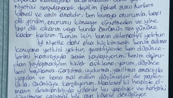 “Merhabalar. 9 yıl boyunca suçsuz yere bir hücrede tutulmamın bin tane zorluğu vardır. Ancak halkın özgürlük, demokrasi ve barış mücadelesinin parçası olmak, tüm zorluklara karşı dayanma gücü, çelikten irade sağlar. Beni en çok zorlayan şeyse imasında dahi bulunmadığım sözlerin, düşüncelerin bana mal edilerek dışarıda kamuoyuna aktarılmasıdır. Bunu yapanların niyetini sorgulayacak değilim fakat şunu herkes bilmeli ve emin olmalıdır; ben buraya onurumla, başı dik girdim. Onurumu kimseye çiğnetmeden ve yine başı dik çıkarım veya burada ömrümün son gününe kadar kalırım. Benim için bunun alternatifi yoktur.