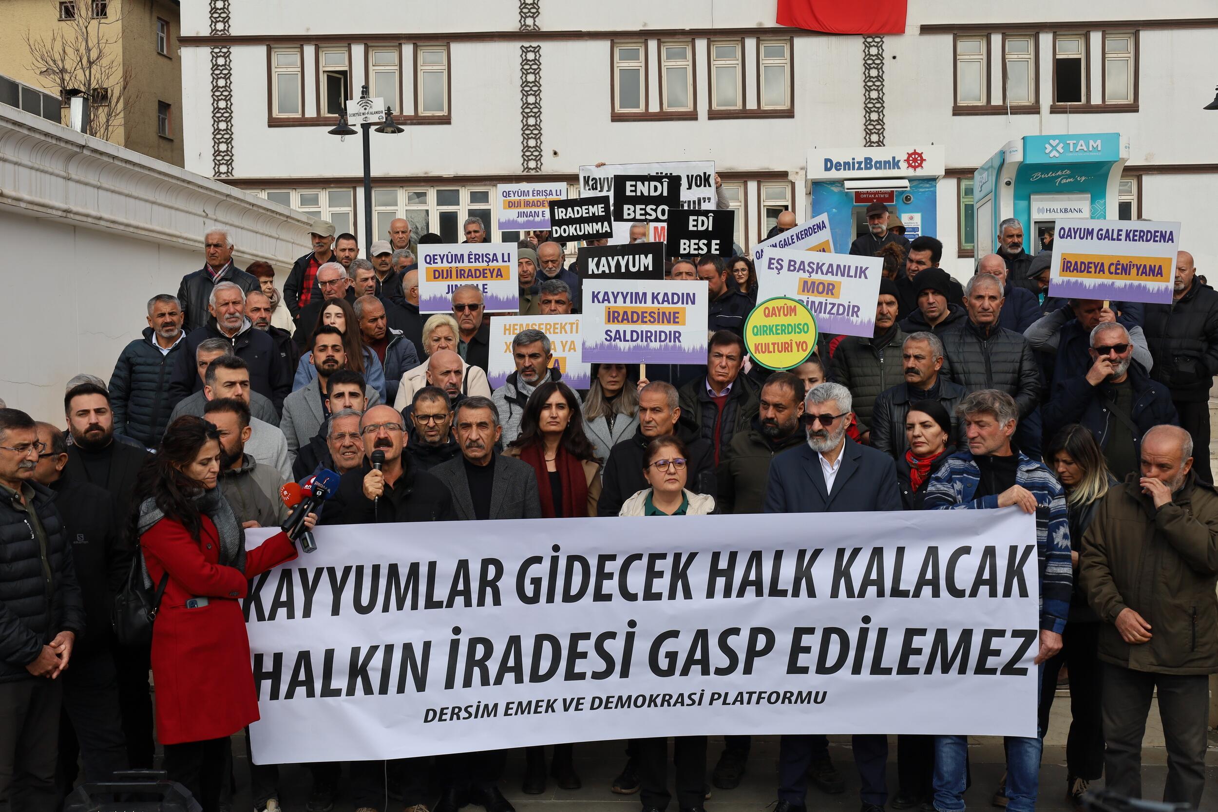 Halkların Eşitlik ve Demokrasi Partisi (DEM Parti) yönetimindeki Dêrsim Belediyesi’ne 22 Kasım 2024’te kayyım atanmasının yıl dönümünde Dêrsim Emek ve Demokrasi Platformu açıklama yaptı. Yeraltı Çarşısı üzerinde yapılan açıklamaya siyasetçiler, platform bileşenleri ve çok sayıda kişi katıldı. Kayyımlar gidecek halk kalacak, halkın iradesi gasp edilemez” pankartının açıldığı açıklamada konuşan Emek Partisi (EMEP) Merkez Disiplin ve Denetleme Kurulu üyesi Mustafa Taşkale, Dêrsim halkının demokratik hakkı olan seçme ve seçilme, özgürlük hakkının elinden alındığına dikkat çekti.