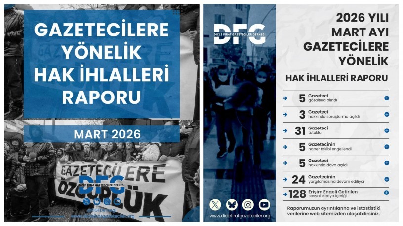 Dicle Fırat Gazeteciler Derneği (DFG)  Gazetecilere Yönelik Mart Ayı Hak İhlalleri Raporu’nu yayınladı. Mart ayının, Türkiye’de basın ve ifade özgürlüğü açısından kaygı verici gelişmelerin yoğunlaştığı bir dönem olarak öne çıkıldığına dikkat çekilen raporda, “Demokratikleşme yönünde adımların beklendiği bir süreçte, gazetecilere yönelik hak ihlallerinin artarak devam etmesi, basın özgürlüğünün yapısal bir baskı altında olduğunu göstermektedir. Nitekim Şubat ayında 6 gazetecinin tutuklanmasının ardından, Mart ayında da 5 gazeteci gözaltına alınmış ve 2 gazeteci yaptıkları haberler gerekçe gösterilerek tutuklanmıştır” denildi.