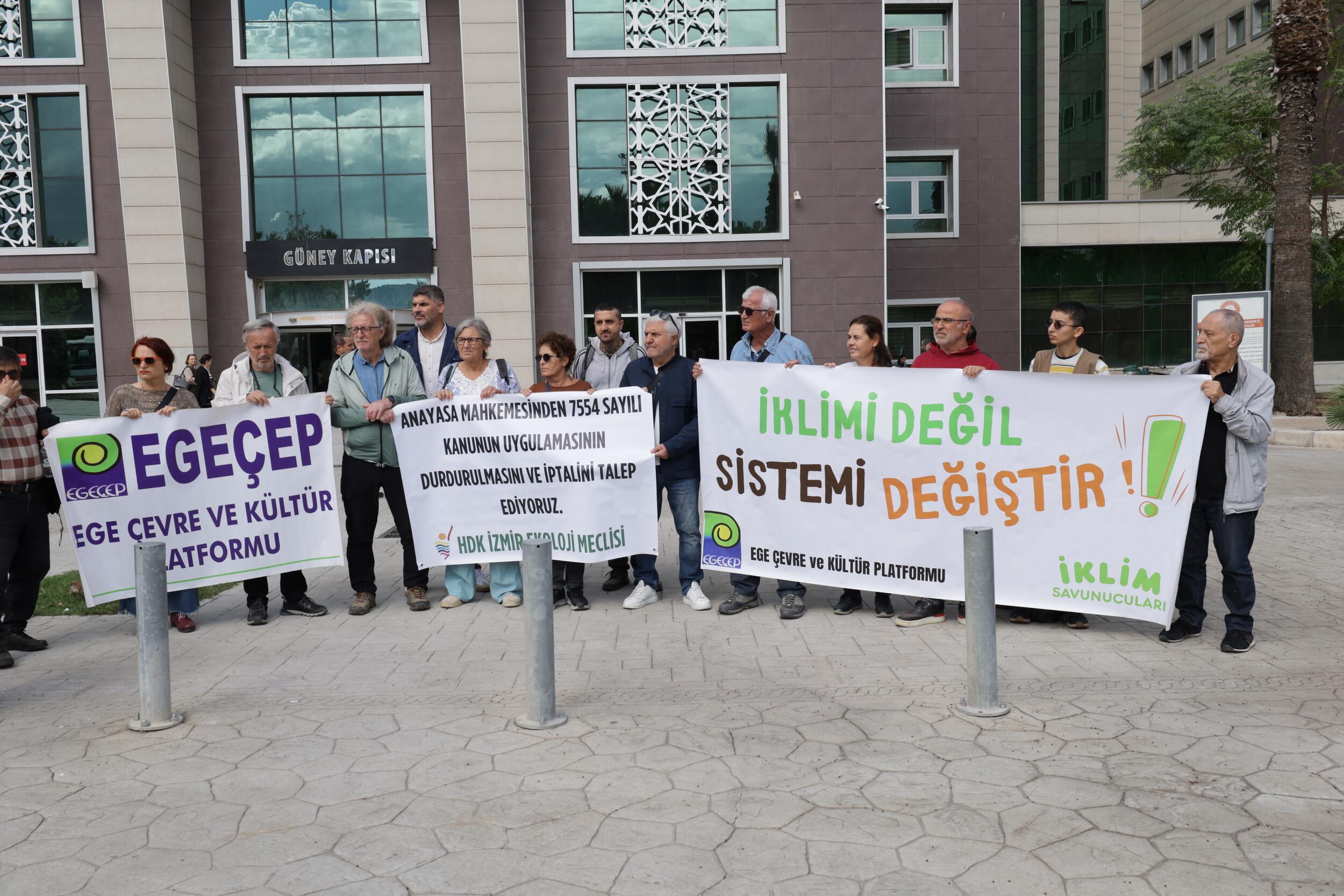 Halkların Demokratik Kongresi (HDK) İzmir Ekoloji Meclisi, maden şirketlerinin doğayı talan etmesinin önünü açan 7554 sayılı yasanın iptali için Anayasa Mahkemesi’ne başvurdu. İzmir Bölge Adliye Mahkemesi önünde yapılan basın açıklamasına Ege Çevre ve Kültür Platformu (EGEÇEP) ve Yeşil Sol Parti temsilcileri de destek verdi. “Anayasa Mahkemesi’nden 7554 sayılı kanun uygulamasının durdurulmasını ve iptalini talep ediyoruz” pankartının açıldığı açıklamada “Havama, suyuma, toprağıma dokunma”, “Talan yasası iptal edilsin” ve “İklimi değil sistemi değiştir” sloganları atıldı. Açıklamayı EGEÇEP Eşsözcüsü Derya Lim yaptı.