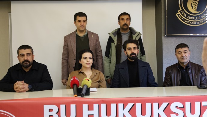 Sağlık ve Sosyal Hizmet Emekçileri Sendikası (SES), İnsan Hakları Derneği (İHD), Wan- Colêmerg Tabip Odası, Türkiye İnsan Hakları Vakfı Wan Temsilciliği, Wan Barosu ve tarafından düzenlenen toplantıda, “Bu hukuksuzluğu kabul etmiyoruz” pankartı yer aldı.