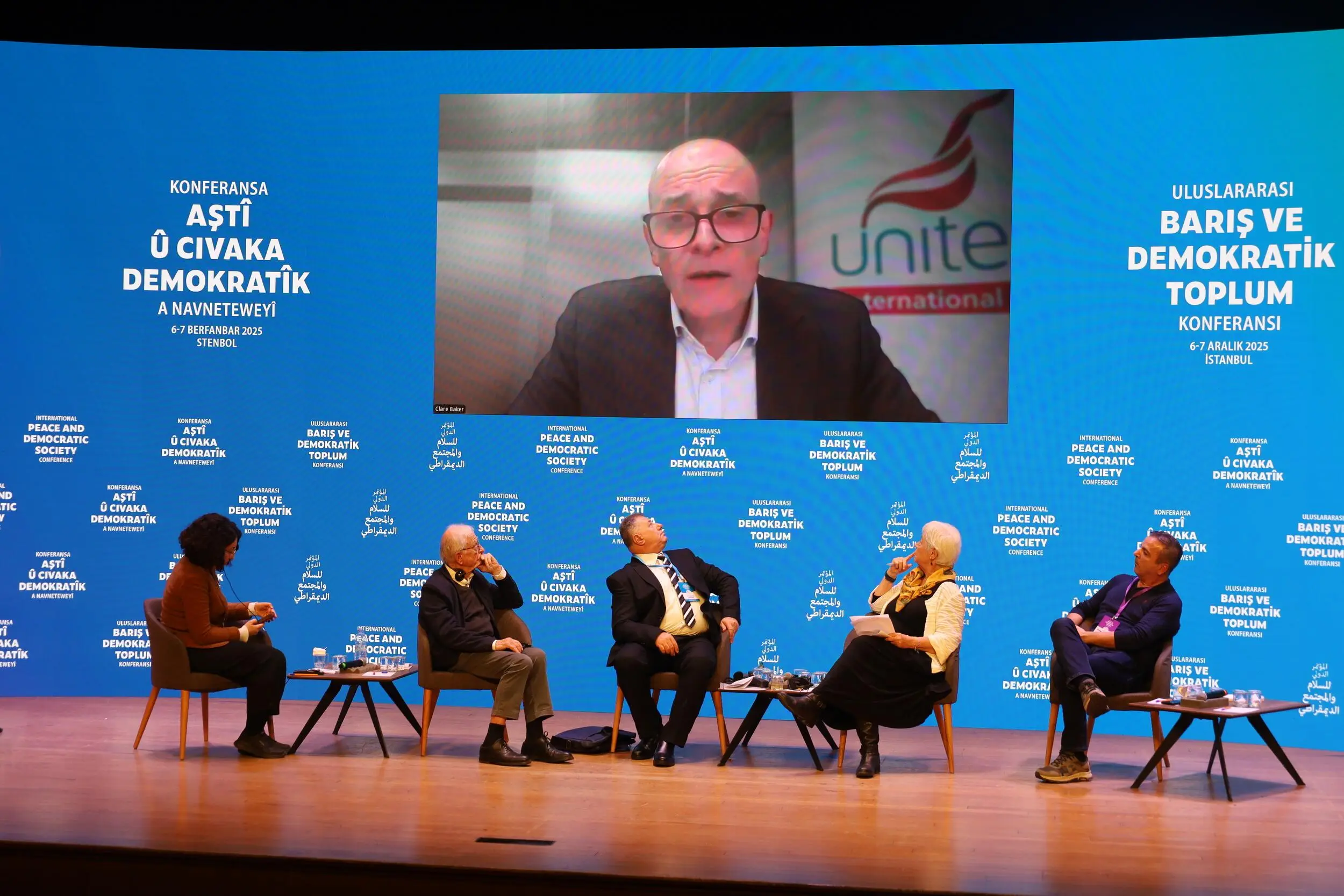 “Bizim için Kürtlerle ve Ortadoğu’daki DAEŞ’in kötülüklerini durdurmayı, bölgede barış ve sosyal adalet getirmeyi amaçlayan daha geniş siyasi hareketle dayanışma içinde olmak kendiliğinden ortaya çıkan bir gereklilikti. İşte bu yüzden Öcalan’a Özgürlük kampanyasını 2016’da kurduk. Biliyoruz ki, sizin hareketiniz de bizimkiyle aynı değerlere sahip. Barış, demokrasi, kapsayıcılık, hoşgörü, kadın hakları, işçi hakları, çevreye ve gezegene saygıyı içeriyor. Ve biliyoruz ki, hareketiniz en korkunç baskılarla karşı karşıya kalmasına rağmen bu hedeflere ulaşmak için yorulmadan çalıştı. Yıllardır Sayın Öcalan’a özgürlük çağrısını destekliyoruz. Çünkü tarihimizden biliyoruz ki barış ancak her iki tarafta baskı ve şiddetin işe yaramayacağını kabul ettiğinde, gerçek sorunlara yönelip kalıcı çözümler aradığında sağlanabilir. Son 10 yılda ya da daha uzun süredir Sayın Öcalan’ın özgürlüğü ve Türkiye ile bölgenin durumu hakkında pek çok tartışma ve görüşme yürüttük. Sendikamda, diğer sendikalarda ve konfederasyonumuzda sayısız karar tasarısı kabul ettik. Kendi dayanışma heyetlerimizi düzenledik ve katıldık. Sayın Öcalan’ı İmralı Adası’nda ziyaret etmeye yönelik tüm girişimleri destekledik. O’nun insanlık dışı tecridinin sona erdirilmesi için siyasi baskı uyguladık ve kampanyayı uluslararası alanda büyütmeye çalıştık. Aynı zamanda değişim yaratmak için mümkün olan en fazla baskıyı oluşturmaya çalıştık. Zaman zaman bu durum, uzak bir umut ya da imkansız bir hayal gibi göründüğü de oldu. Bu nedenle bu yılın başlarında aniden yeni bir girişim başlamasıyla şok olduk ve şaşırdık. Ama hepsinden öte şok olmaktan ve şaşırmaktan daha çok, bu yeni aşamanın bölgeye getirebileceği barış ve uzlaşma beklentileri konusunda heyecanlı ve umutluyduk. Bizim görüşümüze göre, Sayın Öcalan’ın bu yıl 27 Şubat’ta yaptığı açıklama, çok büyük bir dönüm noktası oldu. Türkiye ve Ortadoğu’nun ileriye doğru hareket etmesi için muazzam bir fırsat yarattı.