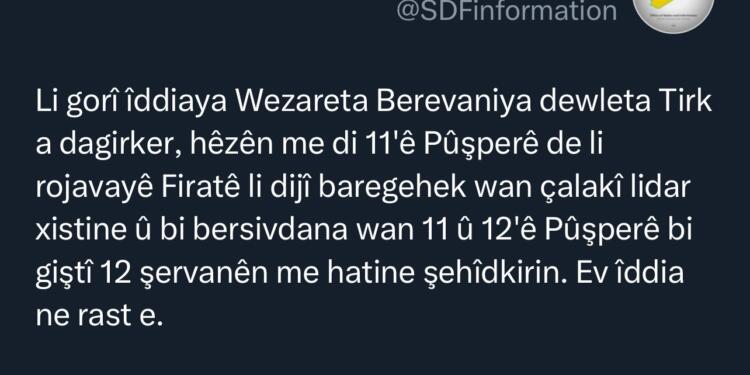 Demokratik Suriye Güçleri (DSG) Basın Merkezi’nden konuya ilişkin yapılan açıklamada, Türk Milli Savunma Bakanlığı’nın kamuoyuyla ’12 DSG’linin yaşamını yitirdiğine’ dair paylaştığı iddiaların asılsız olduğu belirtildi.