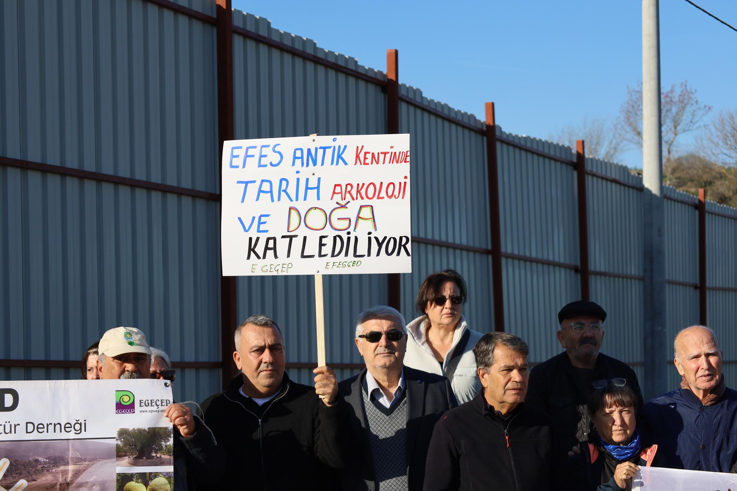 Ege Çevre ve Kültür Platformu (EGEÇEP) tarrafından düzenlenen Ege Ekoloji Kervanı etkinliğinin ikinci gününde İzmir’den yola çıkılarak Efes Antik Kenti, Aydın Söke, Bafa Köyleri ile Milas İkizköy’de bulunan Akbelen ormanında yaşanan ekolojik talan alanları ziyaret edildi. Platform, ilk olarak Efes Antik Kenti’nin alt kapısında yapılan Karşılama Kapısı önünde basın açıklaması gerçekleştirdi. “Doğayı ve yaşamı savunuyoruz” pankartının açıldığı açıklamada, “Efes Antik Kenti’nde tarih, arkeoloji ve doğa katlediliyor”, “Toprağımızı vermiyoruz” dövizleri taşındı.