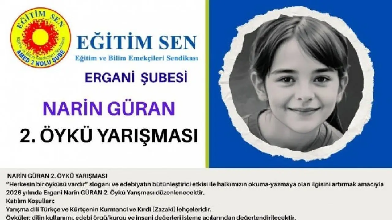 Eğitim ve Bilim Emekçileri Sendikası (Eğitim Sen) Amed 3 Nolu Şubesi, “Herkesin bir hikayesi vardır” şiarıyla 2‘nci Narin Güran Öykü Yarışmasını düzenleyeceklerini duyurdu. Eğitim Sen Amed 3 No’lu Şube Yürütme Kurulu tarafından yapılan açıklamada, yarışmanın Kürtçe’nin Kurmancî ve Kurmançkî lehçeleri ve Türkçe düzenleneceği belirtildi. Başvuruların alınmaya başladığı belirtilen yarışmaya son başvuru tarihi 20 Nisan 2026 olarak duyuruldu.