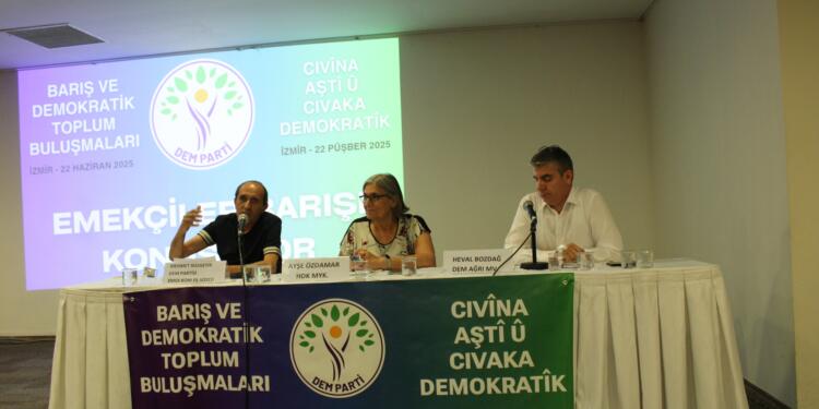 Halkların Eşitlik ve Demokrasi Partisi (DEM Parti) İzmir İl Örgütü, Bayraklı ilçesi Tepekule Kongre Merkezi’nde “Emekçiler barışı konuşuyor” başlıklı buluşma düzenledi. DEM Parti il, ilçe örgütü üye ve yöneticilerinin, sivil toplum örgütü temsilcisi ve çok sayıda katıldığı buluşmanın moderatörlüğünü Halkların Demokratik Kongresi (HDK) Merkez Yürütme Kurulu (MYK) Üyesi Ayşe Özdamar yaptı.