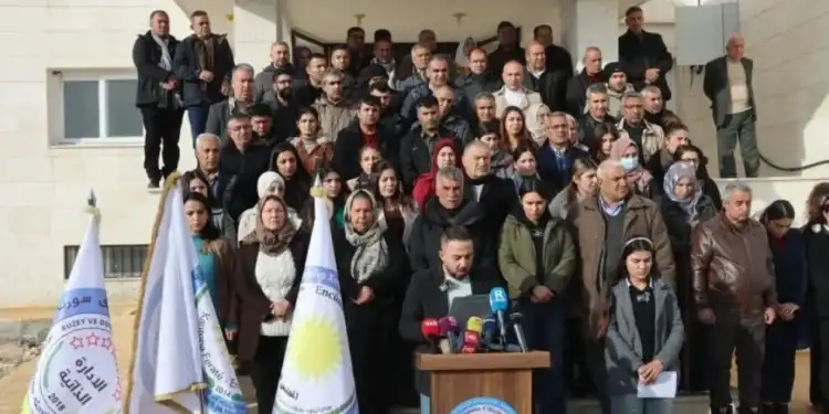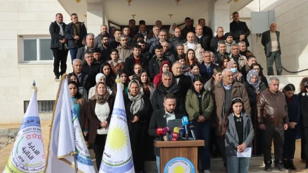 Fırat Kantonu Demokratik Özerk Yönetimi üyesi avukat Mistefa Muslim, Özerk Yönetim temsilcileri ve Halk Meclisi üyelerinin katılımıyla, Demokratik Halk Meclisi genel merkezi önünde basın açıklamasını okudu.