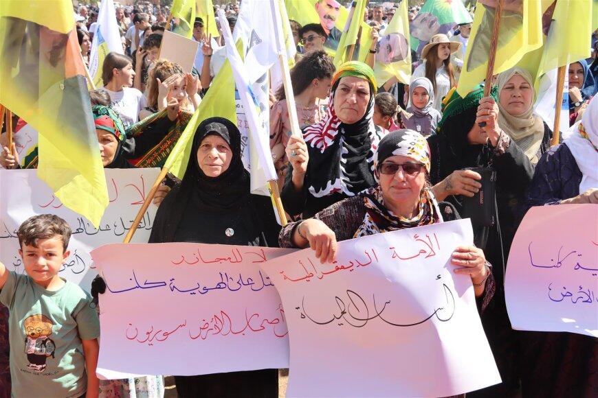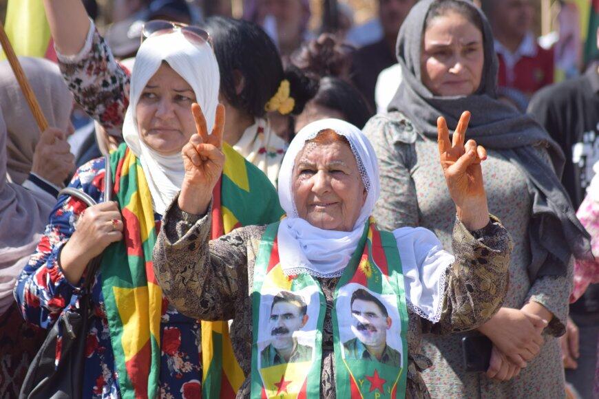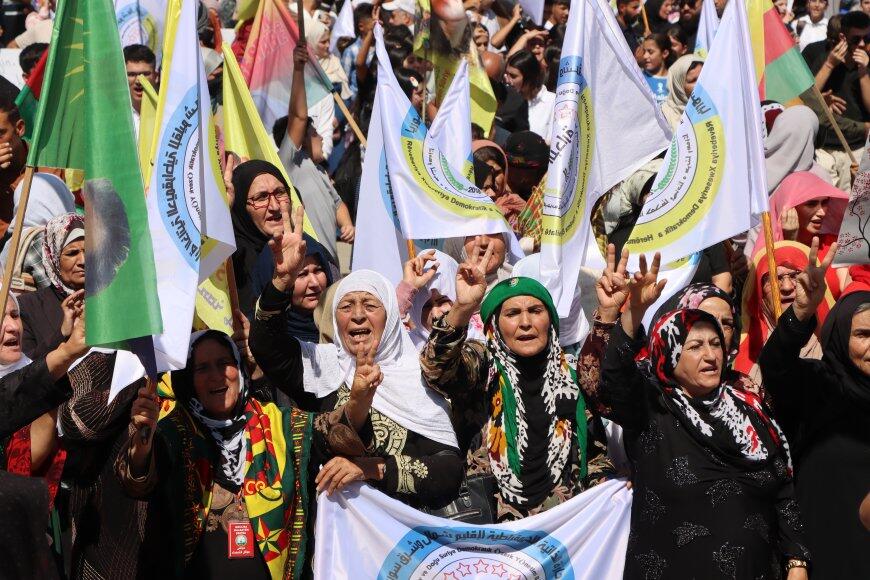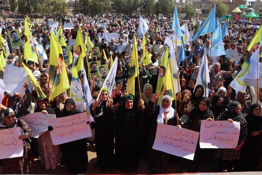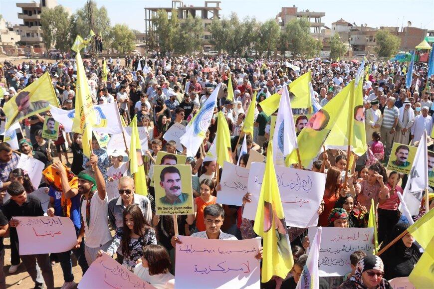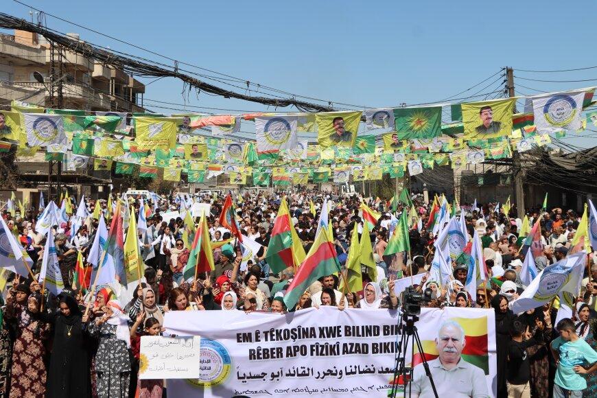 Hesekê’de binlerce Kürt, Arap, Süryani ve Ermeni, “Mücadelemizi yükselteceğiz, Önder Apo’yu fiziki olarak özgürleştireceğiz” sloganıyla kentin Özgürlük Meydanı’nda, Abdullah Öcalan’ın fiziki özgürlüğü için miting düzenledi.