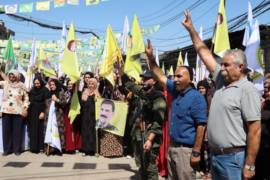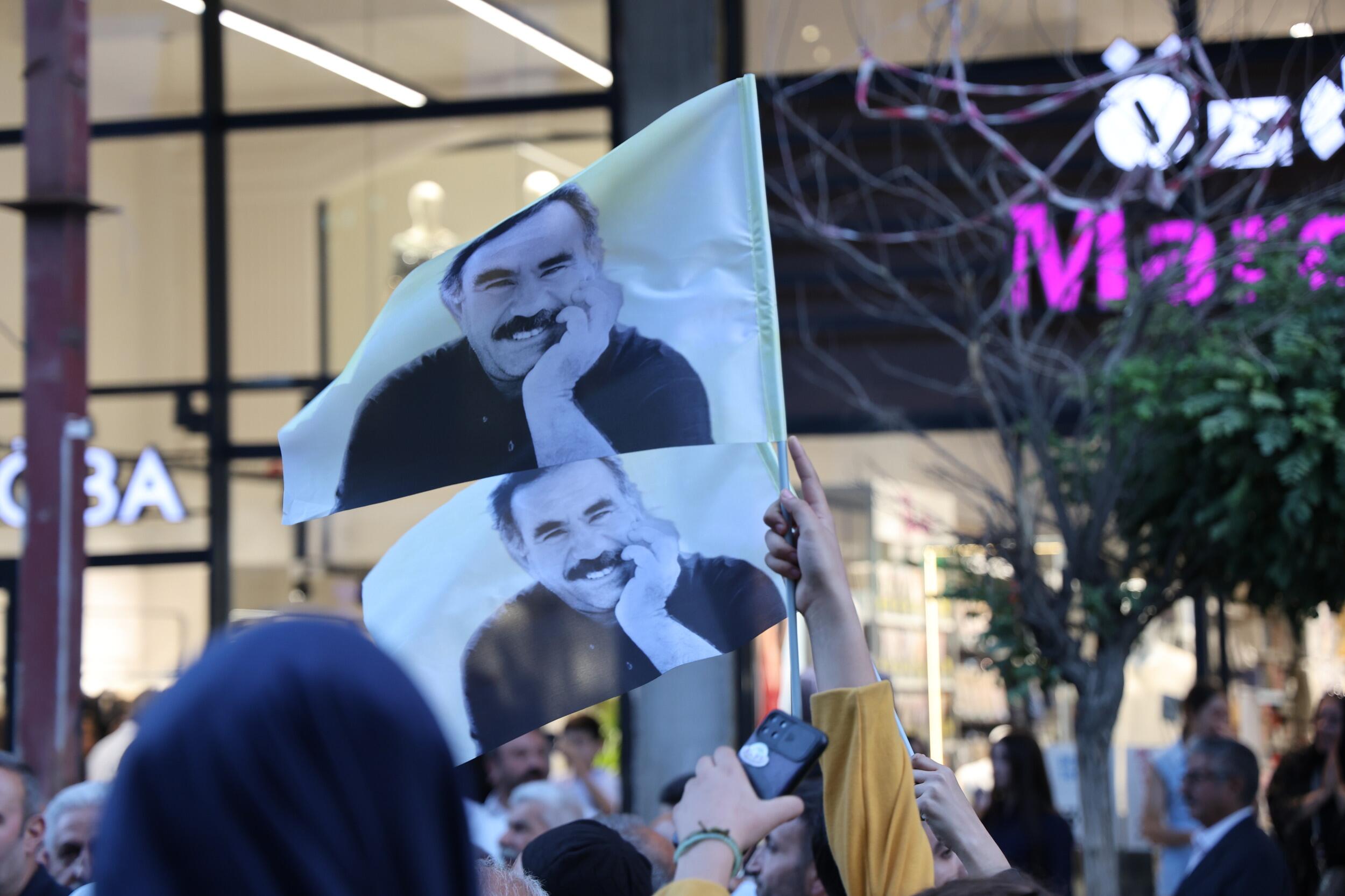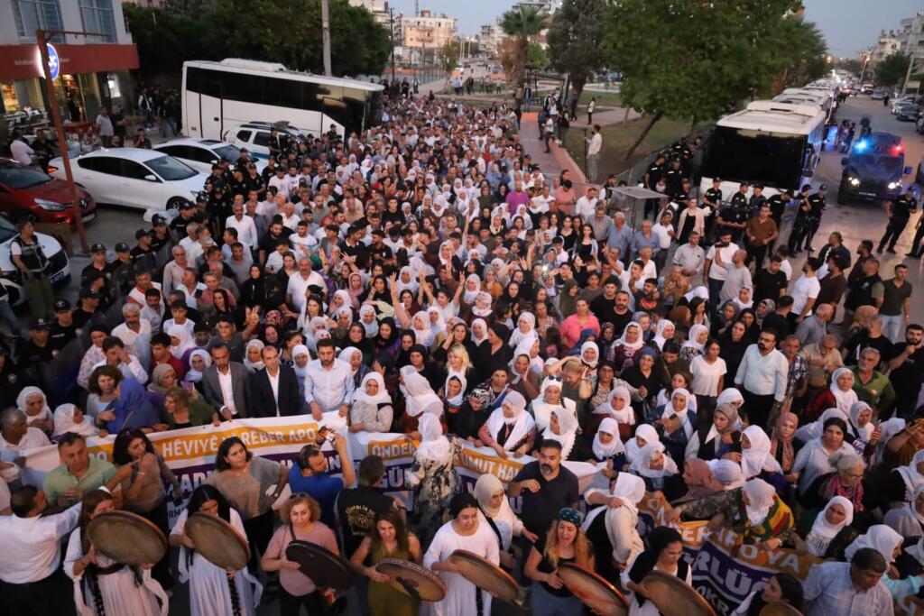 Mersin’de Demokratik Bölgeler Partisi Eş Genel Başkanı Kesin Bayındır ve DEM Parti’li milletvekillerinin de yer aldığı kitle yürüyüş sırasında Kürt Halk Önderi Abdullah Öcalan’ın posterini taşıdı ve sık sık “Bijî serok apo” sloganı attı.